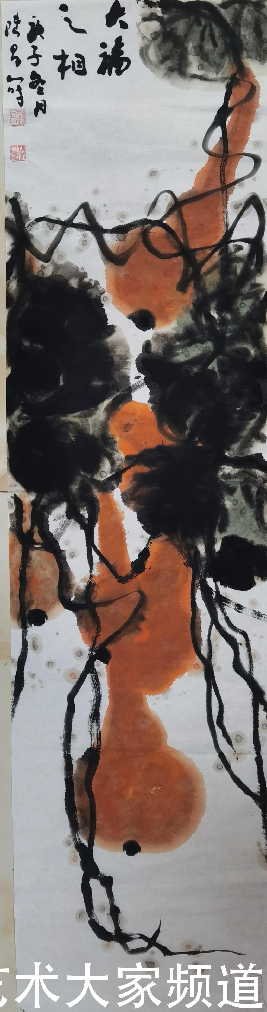 水墨画讲究的就是墨韵,水和墨的调和使得画面产生的韵味,自古至今,以葫芦为题材创作的画家众多。但是能写意葫芦精神面貌的不多。许多画家只是取材于生活中的葫芦形象而不去追寻其人文意义。而宽路老师对葫芦的创作是以人文为中心思想,其画的葫芦,利用我们中国画传统笔墨技法,表现其内在的精神面貌!创作什么就要爱什么,只有寄情于钟爱之物;画的每一幅作品才会传声入意。宽路老师的葫芦作品就是发自内心的释放,这个释放用淋漓的笔墨加以呈现,这可以说是作品可以达到化境的必然。