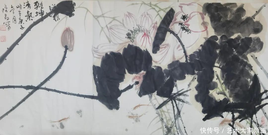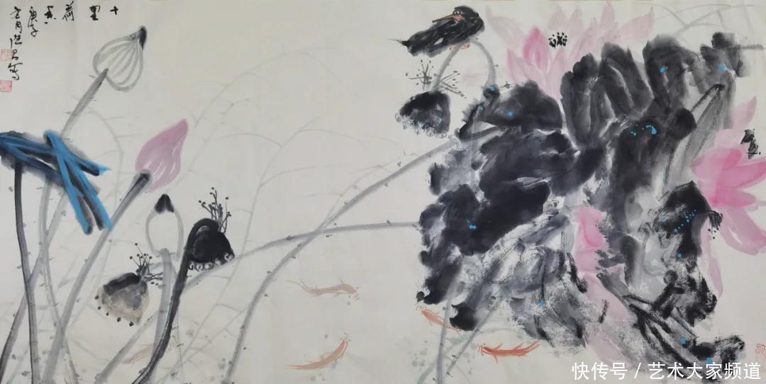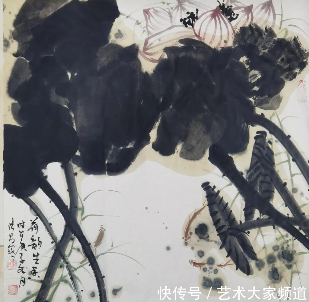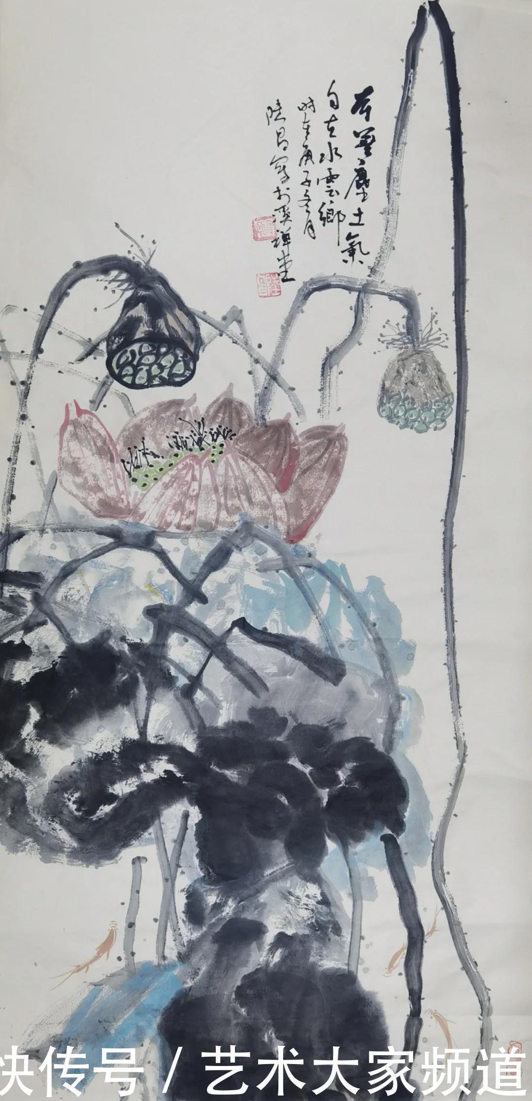 在他众多的花鸟作品中,我最喜欢他的荷花系列。你看:神清骨竦,满纸烟云,真个是芙蓉霞气牡丹色,满池荷叶动秋风。它们神韵秀美,气度平和。与其说是展示了十里荷香的风采,不如说是隐喻了江淮才人的人格魅力。其中有数幅意态奇逸,蕴蓄典雅,行云流水之笔,元气流荡之墨,把它们同八大山人、潘天寿与张大千的荷花放在一起,自有其独到生命,可视为他的经典之作。在这种比较中,他的成功之处是同前人拉开了距离,比前人更亲近于自然,更亲近于读者,是向前跨进了一步。与当代画家比,他拉开了距离,未有与别人雷同之处,完全建构起自己的文化品位,即神韵亲和的独特文化品位。